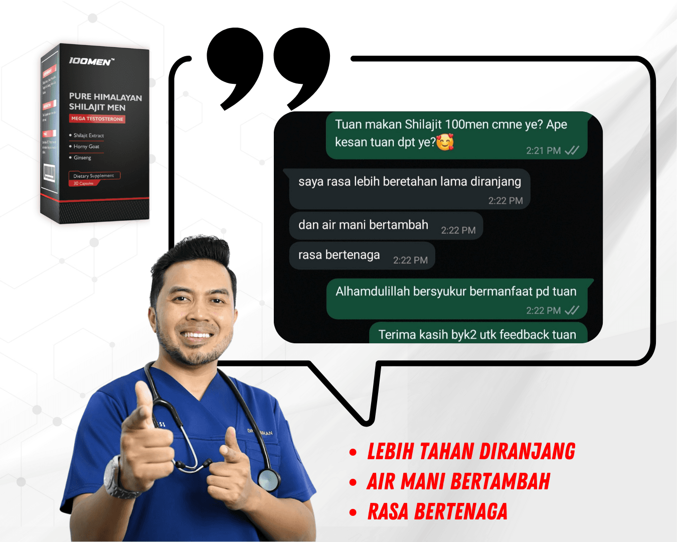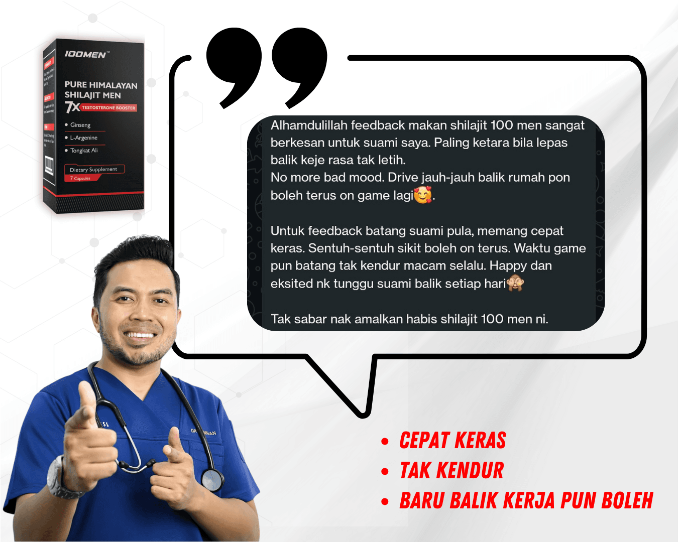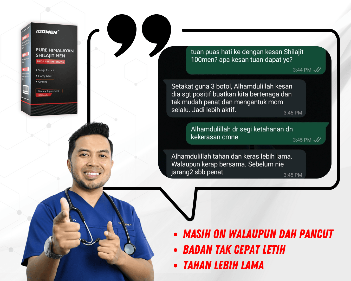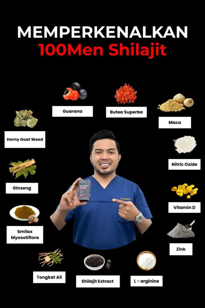100MEN diformulasi oleh doktor dan menggunakan bahan semulajadi 100% seperti Shilajit Himalaya dan 7 herba premium.